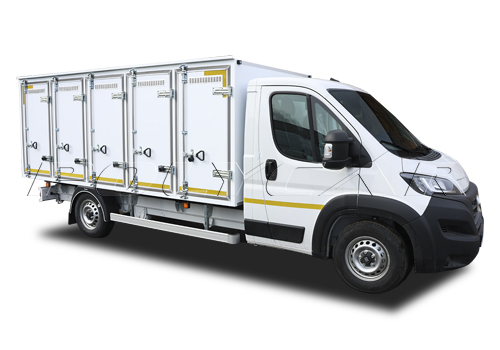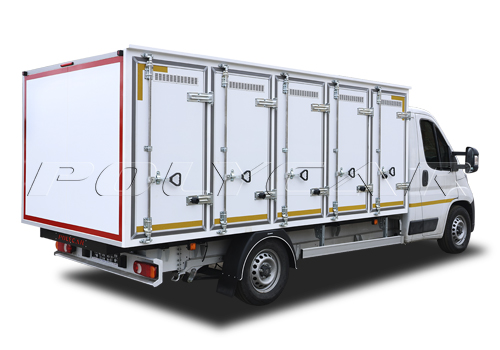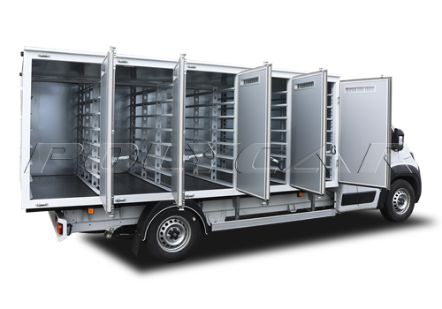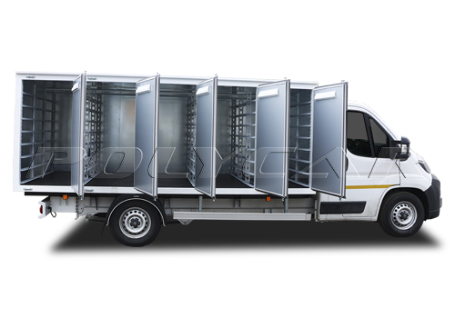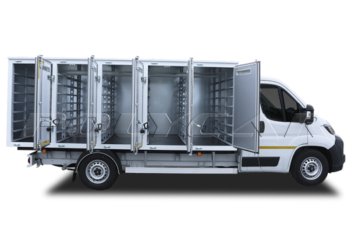 Хлібні фургони призначені для транспортування кондитерських і хлібобулочних виробів в спеціальних лотках. Зсередини вони розбиті на спеціальні відсіки, в яких розміщуються стелажі для лотків. Число відсіків залежить від моделі фургона, типу шасі і потреби замовника. Наша компанія пропонує на вибір декілька стандартних варіантів виготовлення і виробництво під замовлення.