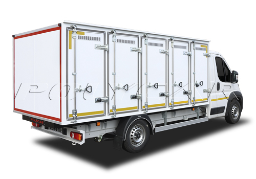Хлібний фургон поліпшеного типу – один з найнадійніших варіантів. Як матеріал стінок використовують наборні сендвіч-панелі. В якості полового покриття може виступати вологостійка бакелітова фанера. Також в даному варіанті передбачена окантовка каркаса алюмінієвим куточком 85х85 мм.