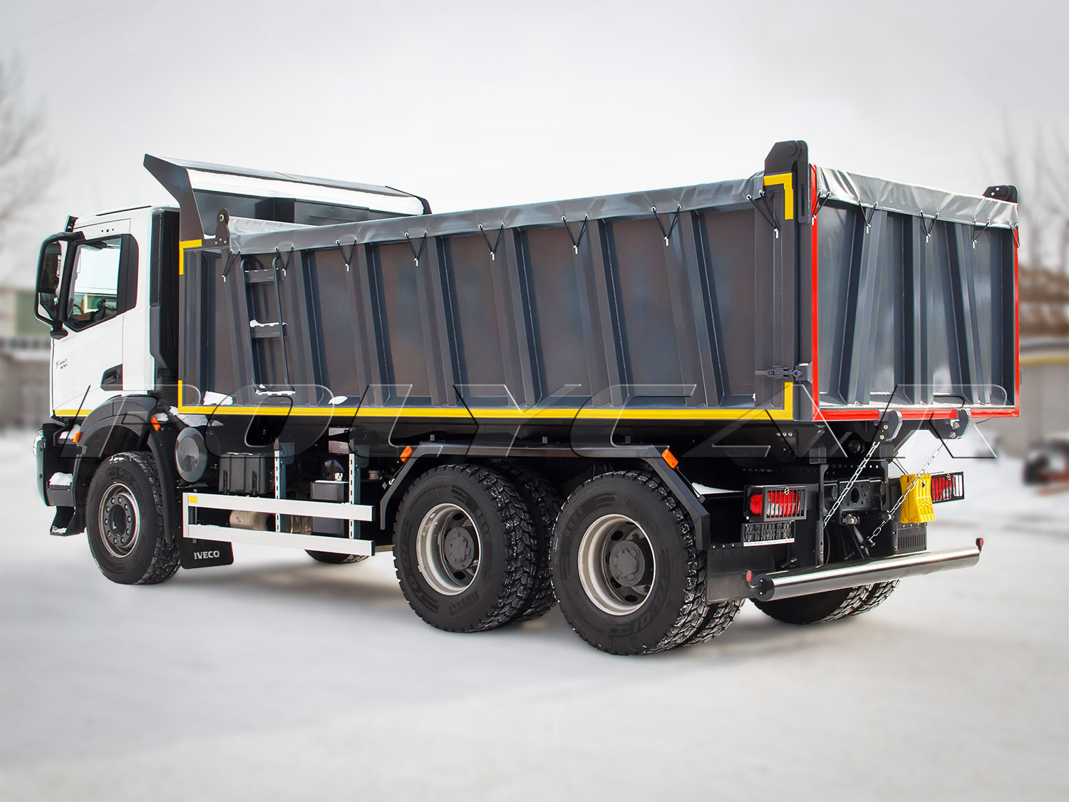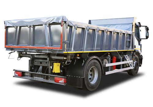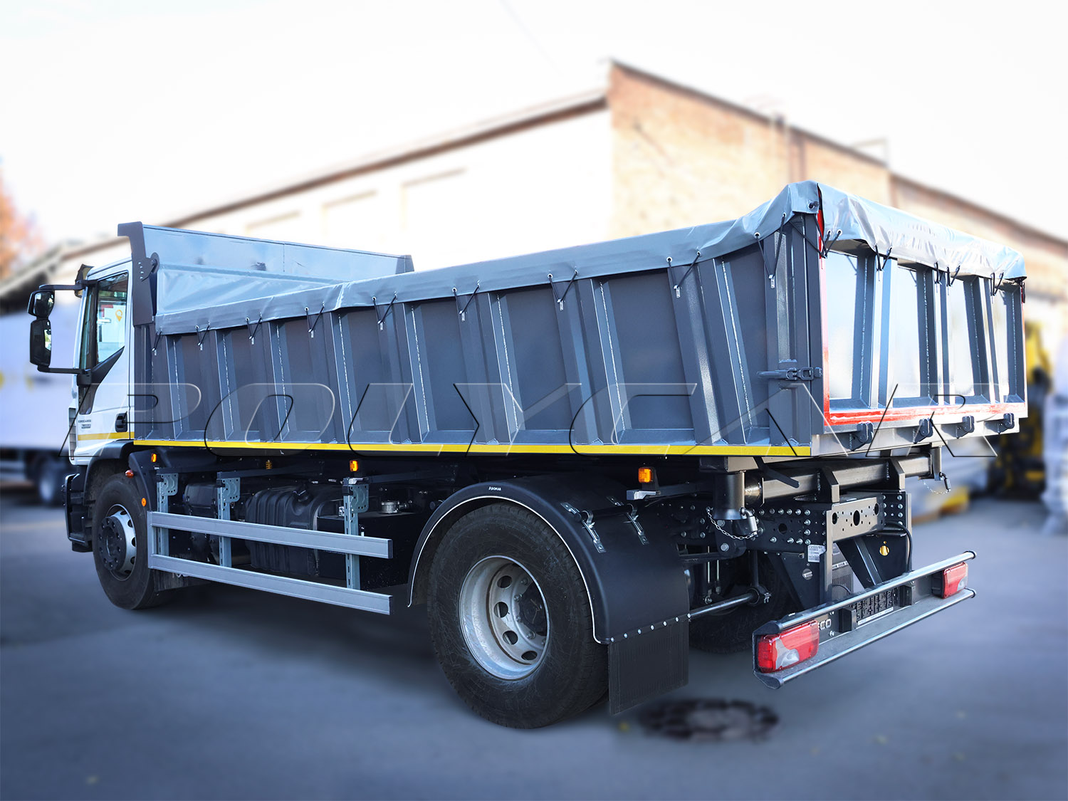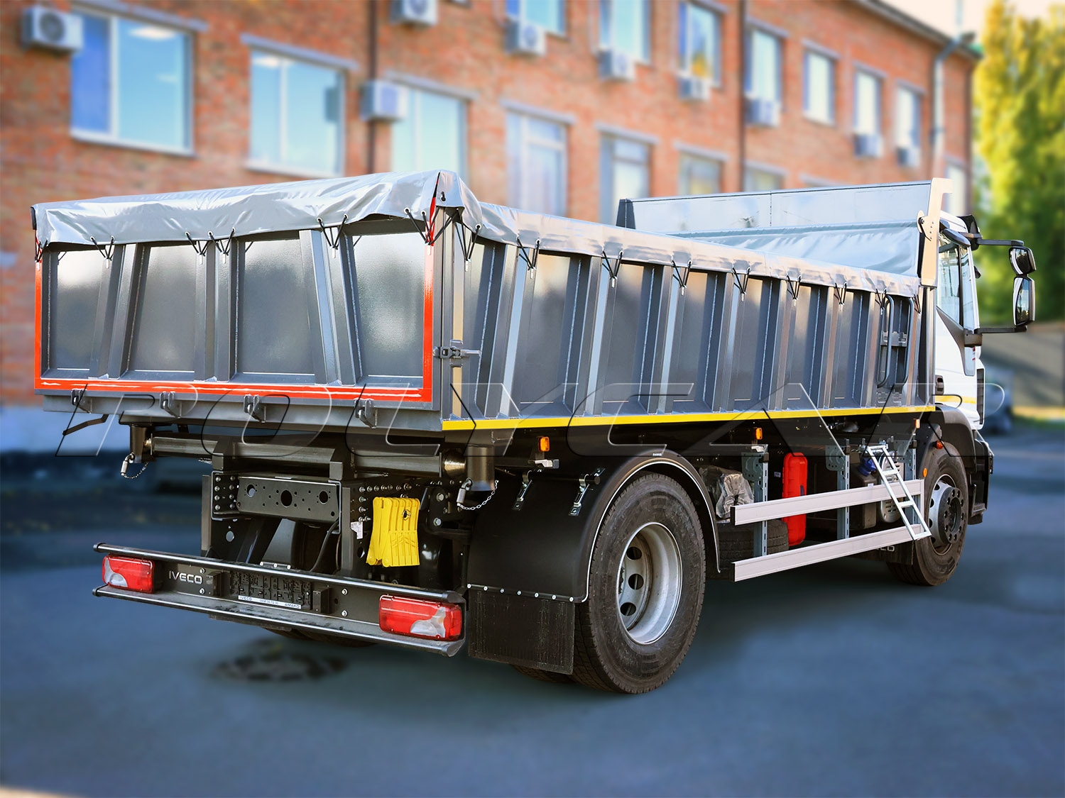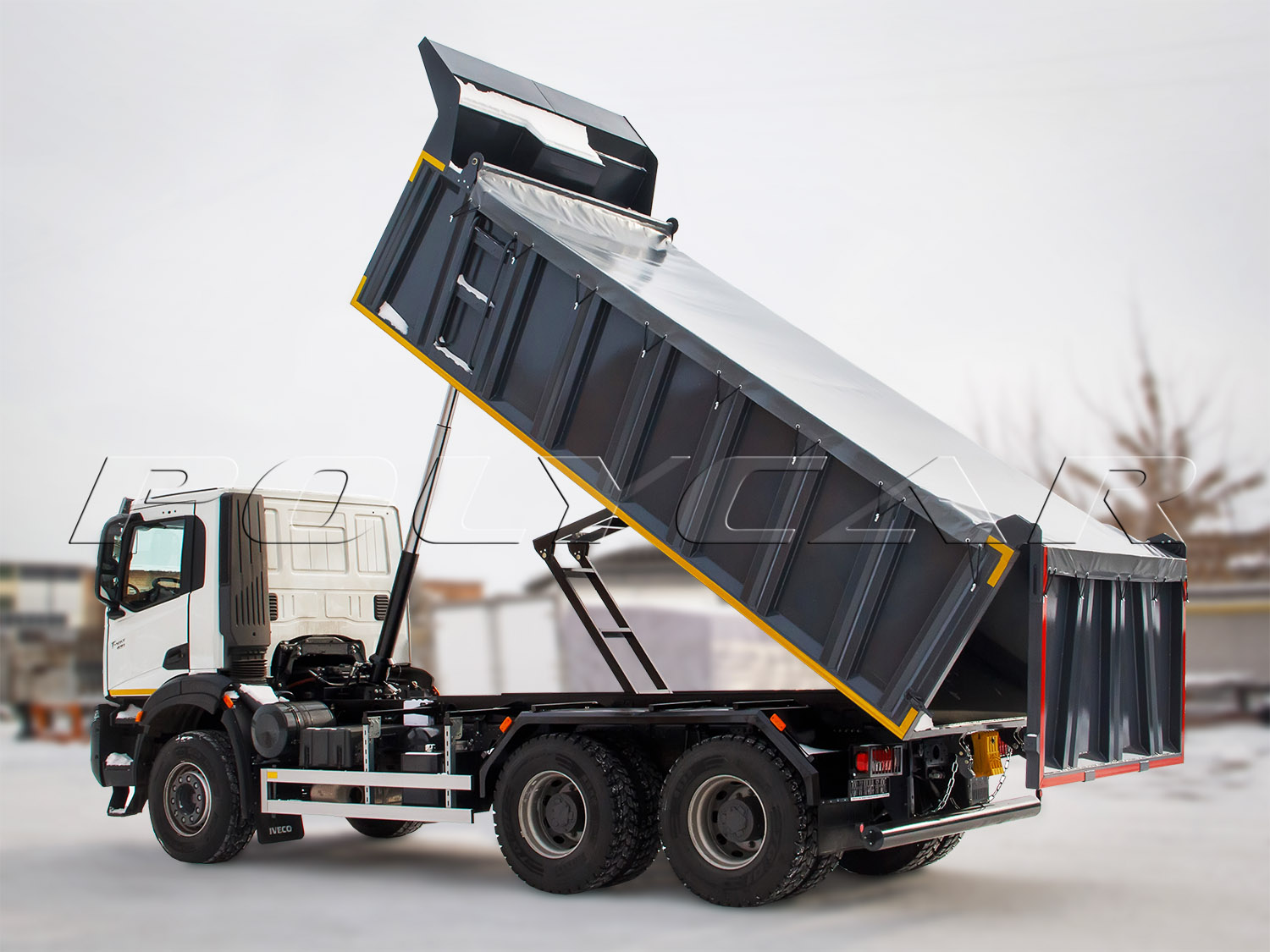 There are several options for unloading a grain tipper: on one and on three sides, the first is rarely used, usually these are high-capacity versions that work in places where there is no limited space for unloading. If there is a choice, due to the small difference in price, most customers choose the three-way unloading option. Unloading is controlled by a remote control. The sides can be made of metal or aluminum profiles and have mechanisms that allow them to be opened in the lower and upper parts, it is also possible to completely remove the side. Bakelite plywood or metal sheets are used as floor coverings. In most cases, this body is equipped with an awning, in the front there is an awning twisting system. There are several versions for various tasks and body types.